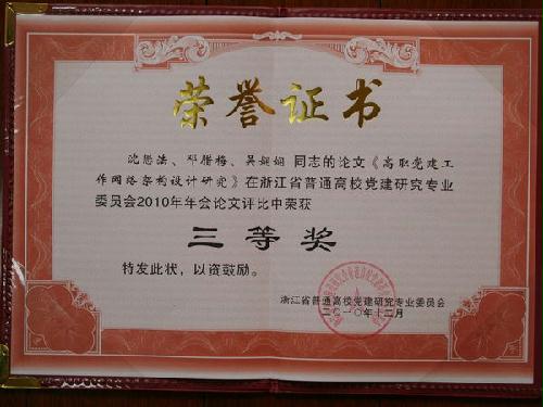 本周一在宁波大学召开的浙江省普通高校党建研究专业委员会年会上传来喜讯,我校沈懋法、邓腊梅、吴娴娴三同志的论文《高职党建工作网络架构设计研究》荣获三等奖。